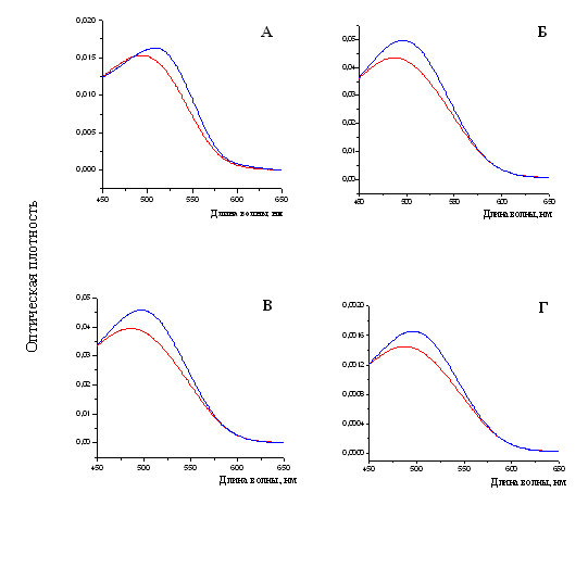 Рис. 18. Спектры поглощения свободного красителя показаны линиями красного цвета. Спектры поглощения красителя Конго красного (линия синего цвета): А – в присутствии фибрилл X-белка (в растворе, содержащем 0.15 М глицин-KOH, рН 7.5); Б – в присутствии фибрилл С-белка (0.15 М глицин-KOH, рН 7.5); В – в присутствии фибрилл Н-белка (0.15 М глицин-KOH, рН 7.5); Г – в присутствии фибрилл тайтина (0.15 М глицин-KOH, рН 7.5). Молярное соотношение красителя и белка 1:2.