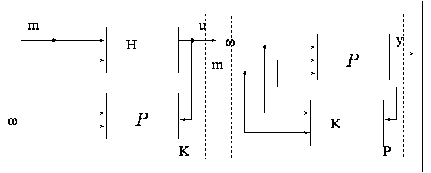 3. Функция взаимодействия К отражает весь процесс Р, так как для любого управляющего сигнала m и возмущающего воздействияW, к- определяет (поскольку k(m,w)=U связующие сигналы, которые поступают на вход подпроцессов Pi и кроме того,U =H(m,P(m,w) К может также рассматриваться как отображение подпроцесса. Рис.5.3
