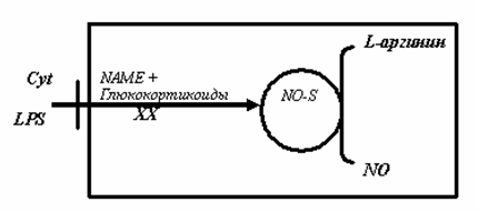 Активация рецепторов гепатоцитов, клеток моноцитарно-макрофагальной системы и некоторых клеток крови цитокинами (Cyt) и липосахаридами (LPS), под влиянием которых происходит индукция индуцибельной синтазы окиси азота, синтезирующей NO из L-аргинина. Блокада (ХХ) i-NOS глюкокортикоидами или другими блокаторами ее активности. Образовавшийся NO диффундирует в межклеточное пространство [8],[9].