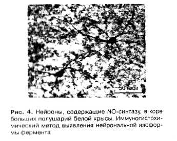 Обобщая имеющиеся данные о нейронах ЦНС, содержащих NO-синтазу, следует отметить, что преимущественная часть их относится к небольшим по размерам клеткам, многие из которых не содержат дендритных шипиков и являются ассоциативными нейронами. Крупные клетки, например пирамидные нейроны коры больших полушарий или гиппокампа, моторные нейроны передних рогов спинного мозга, не содержат NO-синтазу. NO-синтаза сосуществует в нервных клетках с другими традиционными нейромедиаторами и нейропептидами, чаще фермент определяется в холинэргических нейронах [2].