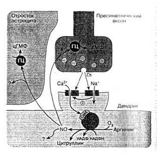 Выделяющийся из синаптических пузырьков возбуждающий нейромедиатор глутамат (Гл) влияет на АМРА (А)-рецепторы, что приводит к деполяризации плазматической мембраны и открытию NMDA(N)-каналов (последнее связано с высвобождением вследствие изменения потенциала мембраны из ионного канала ионов магния, которые закрывали канал). Через NMDA-каналы в клетку поступает большой объем ионов кальция, активирующих конститутивную изоформу NO-синтазы. Образующийся NO, диффундируя в пресинаптический аксон, активирует в нем гуанилатциклазу (ГЦ) и синтез цГМФ, последний способствует усилению выделению нейромедиатора глутамата, что повышает эффективность синаптической передачи (феномен длительной синаптической потенции). NO может также влиять на окружающие астроциты и активировать в них гуанилатциклазу.