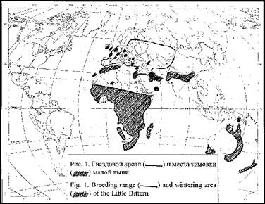 Малая выпь (Ixobrychus minutus) распространена очень широко. Она гнездится повсюду в Европе, кроме Британских о-вов, Дании, Норвегии, Швеции, Финляндии и северных районов Европейской территории России, находящихся севернее 60 параллели. Обитает также в Малой, Передней и Средней Азии, Юго-Западной Сибири (западнее 900 в. д.), Северной Индии, почти по всей Африке (за исключением большинства северных и самых южных районов), на Мадагаскаре, Новой Гвинее, в Восточной и Юго-Западной Австралии, Новой Зеландии (рис. 1). В Западной и Южной Европе, на Ближнем Востоке и севере Африки ареал пятнист, птицы гнездятся изолированными поселениями в благоприятных биотопах. В последние десятилетия найдена на гнездовье в Тунисе (Thomson, Jacobsen, 1979), Омане (Gallagher, 1986), в Персидском заливе (Bundy, Warr, 1980). Многие местообитания вида в Европе уничтожаются вследствие осушения болот и коррекции речных берегов.