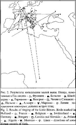 По сведению центров кольцевания, до настоящего времени в Европе и Северной Африке окольцовано приблизительно 6500 малых выпей и получено около 100 возвратов с дальних или ближних дистанций (Junge, 1941,1951,1952; Junge, Taapken, 1953, 1954, 1957; Verheyen, 1955, 1962, 1969, 1971; Taapken, 1957; Erard, 1969, 1970; Schildmacher, Pörner, 1967; Nankinov, Djingova, 1981, Nankinov et al. 1984, 1986; Speek, Speek, 1984; Wassenаar, 1984; Schmidt, 1985). Некоторые из результатов кольцевания уже обобщены и опубликованы (Zink, 1961; Hudec, Cerny et al., 1972). Кроме этих источников, при подготовке данного материала нами были использованы и неопубликованные материалы из Германии, любезно предоставленные доктором P. Schmidt, за что мы выражаем ему нашу сердечную благодарность.