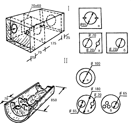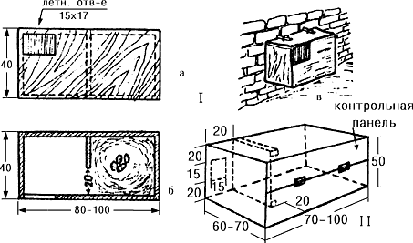 Два варианта гнездовий для домового сыча: I - схема ящичного гнездовья: а - передняя стенка с летным и <ориентационным> отверстиями; б - средняя стенка; в - задняя стенка с запирающимся контрольным отверстием; II - <сычиная труба>: а, б, в - аналогично. Все размеры даны в мм.