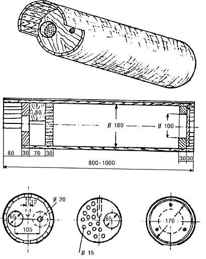 Отверстие с обеих сторон забивается досками, в одной из них делается леток. Такое гнездовье -трубка подвешивается в лежачем положении внизу к большой ветке дерева. Разработаны эффективные конструкции, позволяющие защитить сычей от хищников. Для этого в гнездовье типа <трубка> или подобном по форме, но сбитом из досок, делают две стенки с летком на расстоянии 10 см одна от другой. Образуются своеобраз ная веранда. Леток диаметром 6,5 см делается в стенках с противоположных сторон. Напротив каждого из летков в другой стенке сверлят отверстия 1,5-2 см для прохождения воздуха. Птица легко развернется в тесном помещении, хищники же забраться в гнездовье не могут. В задней стенке гнездовья можно сделать отверстие, которое закрывается, для контроля и очистки гнездовья. Длина такого гнездовья 80-85 см, часто делают крышку над летком, углубляя переднюю стенку на 5-10 см внутрь гнездовья, тогда его делают несколько длиннее. Внутренний диаметр 18-20 см. Гнездовье укрепляется проволокой сверху к толстой ветке, в развилке, под крышей дома. На дереве леток должен быть обращен внутрь кроны. Гнездовье укрепляется в зарослях среди веток. На гнездовом участке одной пары сычей желательно устраивать 2-3 таких гнездовья.