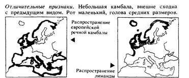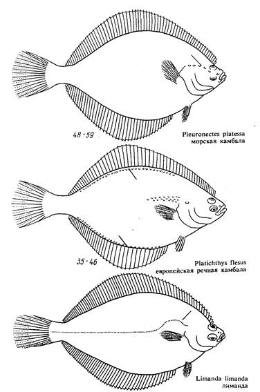 Многочисленное семейство камбаловых рыб объединяет камбал, у которых оба глаза расположены на правой стороне; в период метаморфоза левый глаз передвигается с левой стороны на правую. У некоторых видов, например у речной камбалы, глаза часто бывают и на левой стороне тела, у морской камбалы и у лиманды это бывает реже, а у остальных видов — исключительно редко. Семейство камбаловых широко распространено в умеренно теплых и умеренных водах Атлантического и Тихого океанов, причем наиболее многочисленно оно в первом из них. Большинство видов обитает на дне на небольших глубинах, но некоторые встречаются и на больших глубинах в верхней части континентального шельфа. Некоторые виды, особенно гренландский палтус, и в меньшей степени атлантический палтус, живут иногда в средних слоях моря и являются активными пловцами и охотниками. У этих видов верхний глаз расположен ближе к краю головы, что обеспечивает им более широкий обзор. Зубы у них крепкие, хорошо развиты на обеих сторонах челюстей. В североевропейских водах известно пять видов камбаловых, один из которых — речная камбала — живет и в пресной воде, но там не размножается."