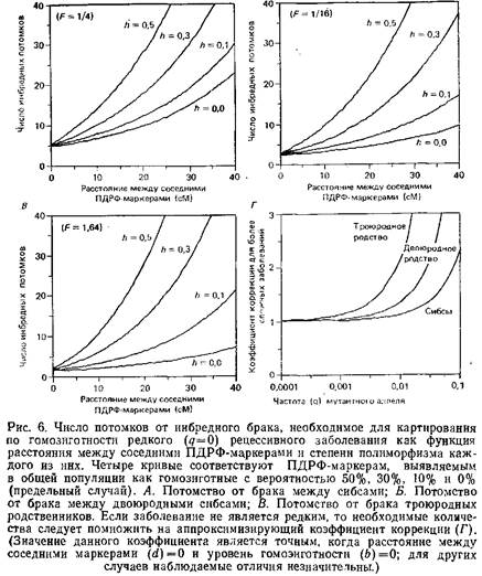 Конечно, невозможно с высокой точностью распознавать гомозиготность «по происхождению». Однако можно использовать плотную карту сцепления на основе ПДРФ для поиска района, в котором многие прилегающие ПДРФ-маркеры становятся гомозиготными. Эффективность этого метода будет зависеть от плотности используемых маркеров рестрикции и уровня их полиморфизма. Рис. 6 показывает количество потомков от брака двоюродных и троюродных сибсов, необходимое для картирования гомогенного рецессивного заболевания. Если использовать карту ПДРФ с полиморфными локусами на каждые 5 см, для обнаружения сцепления понадобится менее 20 инбредных детей в таких браках. Для относительно редких рецессивных заболеваний метод гомозиготного картирования может оказаться лучшим.