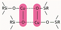 Итак, большая часть атомов меди почему-то “выключена” из катализа. Нам удалось обнаружить причину этого с помощью магнитных измерений и спектральных исследований исходных металлорганосилоксанов. Выяснилось, что значительная часть атомов металла связана в межцепные координационные кластеры [2] (рис.6). Металл стремится заполнить свою координационную сферу, привлекая атомы кислорода соседних фрагментов –Si–O–M–, а оказавшись координационно-насыщенным, с трудом взаимодействует с реагентом CCl4.
