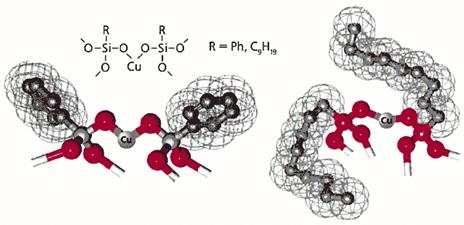 Как предотвратить образование межцепных кластеров? Можно, например, “укрыть” металл каким-либо лигандом. Это, безусловно, затормозит межцепную координацию, но не поможет решить основную задачу, поскольку лиганд в свою очередь затруднит приближение реагента. Тем не менее мы справились с ней, когда привлекли к участию органическую группу, связав ее с кремнием. Жесткая и мало подвижная фенильная группа, обрамляющая кремний в исследованных металлорганосилоксанах, не может препятствовать координационному взаимодействию атомов меди в соседних цепях. Если заменить фенильную группу на нонильную, ситуация меняется (рис.7). Объемистая алифатическая группа будто “окутывает” металлические центры и потому эффективно предотвращает координационное взаимодействие атомов меди в соседних цепях. Но в реакционной среде эта группа обладает подвижностью полимерного сегмента и не препятствует приближению органического реагента к каталитическому центру. Таким образом, четыреххлористый углерод как бы отодвигает нонильную группу, чего не может сделать атом меди соседней цепи.