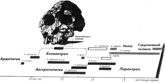Череп кениантропа и его местоположение среди разных видов и родов, предшествовавших происхождению современного человека. Ардипитек – наиболее ранний из известных гоминид, или человекообразных. Он родственен австралопитекам, в частности A.anamensis, живших в Кении около 4 млн лет назад. Считается, что А.anamensis являлся своеобразным общим звеном, через которое шла рамификация-радиация разных направлений эволюции: австралопитеков с Люси в качестве наиболее известного представителя, которые «выродились» в конечном итоге в парантропов, а также кениантропов, развитие которых в конечном итоге привело к производящему орудия H.habilis («умелый») и H.erectus («прямоходящий»). Несет ли H.erectus в себе гены H.habilis, еще предстоит выяснить, но так или иначе от него произошел неандерталец, просуществовавший на Земле в 10 раз дольше вида H.sapiens, а затем и H.sapiens.