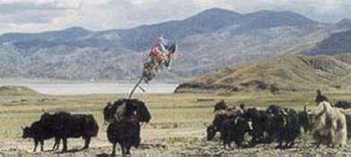 К седлу одного из яков по древнему обычаю были прикреплены ветки с привязанными к ним разноцветными молитвенными флажками. Тибетцы верят, что ветер, раздувая флажки, возносит написанные на них молитвы к небесам. Эти молитвы должны защищать их во время долгих и трудных переходов.