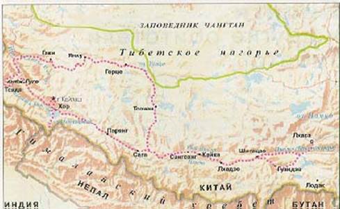 Схема Тибетского нагорья. Пнктиром показан маршрут экспедиции