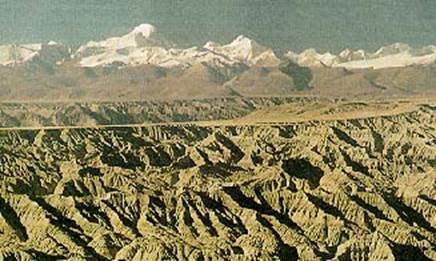 Вид с плато на глиняные горы и снежные вершины Гималаев |