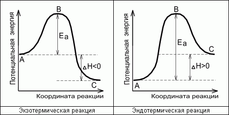 А - реагенты, В - активированный комплекс (переходное состояние), С - продукты.