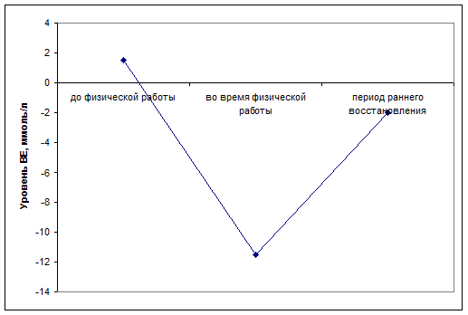 При выполнении физической работы выявлен существенный дефицит ВЕ, так как возникла необходимость в поддержании гоместаза в условиях закисления.