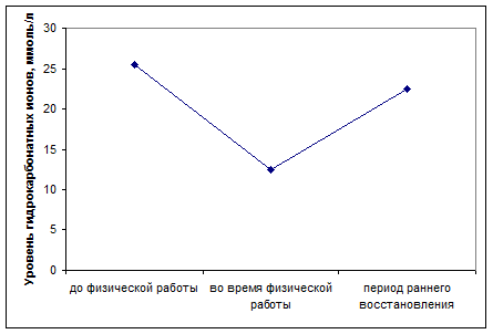 До физической работы в капиллярной крови спортсменов выявлено незначительное повышение содержания гидрокарбонатных ионов по сравнению с физиологической нормой, что также указывает на высокий уровень развития щелочных резервов организма.