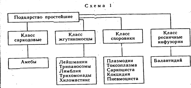 Многочисленные виды одноклеточных организмов по современной зоологической классификации относятся к подцарству простейших. Часть из них ведет паразитический образ жизни.