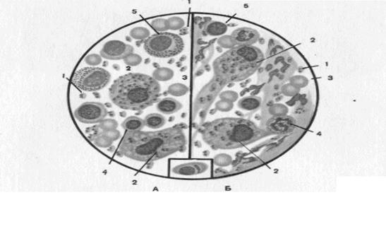 Рис. № 1 Leishmania donovani (А) 1 лейшмания свободнолежащая, 2 лейшмании внутриклеточные, 3 эритроцит, 4 нормобласт, 5 промиелоцит. Leishmania tropika (Б) 1 лейшмания свободнолежащая, 2 лейшмании внутриклеточные, 3 эритроцит, 4 нейтрофил, 5 лимфоцит