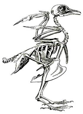 3) Скелет птиц в связи с приспособлением к полету легкий и прочный. Легкость обусловлена пневматичностью, а прочность - срастанием отдельных костей еще в раннем возрасте (череп, туловищный отдел позвоночника, цевка, кости кисти и других) Трубчатые кости полые, содержат воздух, поэтому они легкие. В скелете выделяют шесть отделов: череп, позвоночник, пояс передних конечностей, скелет передней конечности, пояс задних конечностей, скелет задней конечности. Череп характеризуется большими размерами мозговой коробки и глазниц, беззубыми челюстями. Тонкие кости черепа срастаются, не образуя швов. Для сочленения черепа с позвоночником служит один мыщелок. Позвоночник состоит из шейного, грудного, поясничного, крестцового и хвостового отдела. Только шейный отдел подвижен, все остальные малоподвижны или срослись между собой (конечные хвостовые отделы срастаются в копчиковую кость). Имеется грудная клетка, образованная грудными позвонками, отходящими ребрами и грудиной. У летающих птиц и пингвинов грудина несет высокий гребень - киль, к которому прикрепляется сильные мышцы, обеспечивающие движение крыльев (или ластов). Плечевой пояс состоит из лопатки, поракоида и ключицы - он создает опору для крыльев. Тазовый пояс состоит из трех парных костей: подвздошной, седалищной и лобковой. Внизу кости таза не соединены, что связано с откладыванием крупных яиц.