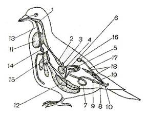 14-нижняя гортань; 15-легкие и воздушные мешки; 16- семенники;