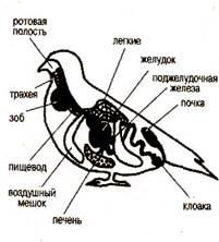 6) Дыхательная система имеет ряд особенностей, связанных с приспособлением к полету. Начинается ноздрями, расположенными у основания надклювья. Изо рта гортанная щель ведет в гортань, а из нее в трахею. В нижней части трахеи и начальных участков бронхов находится голосовой аппарат - нижняя гортань. Источником звуков служат вибрирующие при прохождении воздуха перепонки между последними хрящевыми кольцами трахеи и полукольцами бронхов. Бронхи проникают в легкие, разветвляются в них на мелкие трубочки - бронхиолы - и очень тонкие воздушные капилляры, которые образуют в легких воздухоносную сеть. С ней тесно переплетаются кровеносные сосуды, газообмен происходит через стенки капилляров. Часть бронхиальных ответвлений не разделяется на бронхиолы, выходит за пределы легких, образуя тонкостенные воздушные мешки, расположенные между внутренними органами, мышцами и даже внутри полых костей. Объем воздушных мешков почти в 10 раз превышает объем легких. Парные легкие небольшие и мало растяжимы, они прирастают к ребрам по бокам позвоночника. В спокойном состоянии и во время движения по земле акт дыхания осуществляется за счет движения грудной клетки. Грудная кость при вдохе опускается, отдаляясь от позвоночника, а при выдохе поднимается, приближаясь к нему. Во время полета грудная кость неподвижна. При поднятии крыльев происходит выдох, богатый кислородом воздух попадает из воздушных мешков в легкие, где осуществляется газообмен. Таким образом, насыщенный кислородом воздух проходит через легкие два раза: и при выдохе, и при вдохе (так называемое двойное дыхание). Воздушные мешки предотвращают перегрев организма, так как избыток тепла удаляется с воздухом.