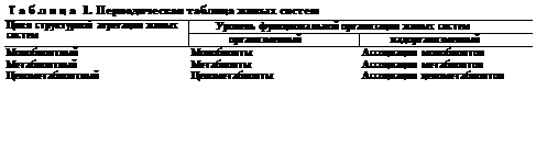 турная агрегация живых систем явилась стержнем их закономерного циклического развития и послужила основой периодических явлений в их эволюционном функционально-структурном усложнении. В схематической форме периодический характер эволюционного развития живых систем показан в виде периодической таблицы, которая объединяет все существующие варианты живых систем.