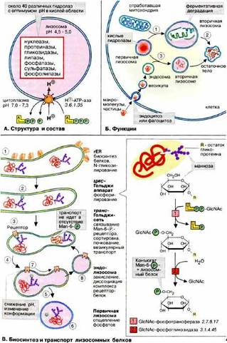 Лизосомы содержат пищеварительные ферменты, которые разрушают отработанные органеллы, а также частицы и молекулы, поглощенные клеткой извне путем эндоцитоза. Рис. 7 (Б).