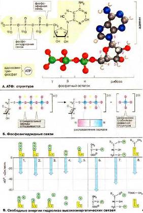 В клетке химическая энергия запасается в виде так называемых «высокоэнергетических» метаболитов. Наиболее важным таким метаболитом, макроэргом обеспечивающим энергией большое число энергозависимых реакций, является АТФ. Рис. 8 (А).