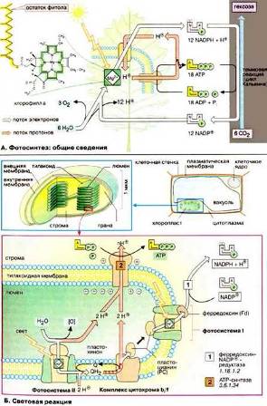 Хлоропласты – это органеллы, которые, подобно митохондриям, окружены двумя мембранами. Во внутреннем пространстве, строме, находятся тилакоиды, уплощенные мембранные мешки, которые будучи сложены стопками образуют граны. Внутреннее содержимое тилакоида называют люменом. Рис. 10 (в голубой рамке).