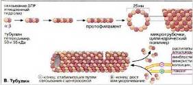 Белком микротрубочек является тубулин, полимеризация которого приводит к образованию этих структур. Еще есть белки, ассоциированные с микротрубочками (MAP) и белки – транслокаторы. Тубулин – очень консервативный белок, связывающий две молекулы ГТФ, и может также связывать ионы кальция и магния. Функция динеина в биении ресничек и жгутиков, преобразуя энергию АТР в механическое усилие. Микротрубочки имеют две основные функции – двигательную и структурную. Двигательная функция заключается в том, что по микротрубочкам с помощью специальных транспортных белков – транслокаторов – осуществляется движение клеточных органелл. Структурная функция состоит в поддержании с помощью микротрубочек определенной формы клетки или ее части.