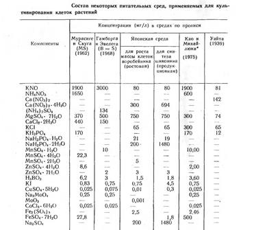 В таблице представлен состав наиболее часто используемых питательных сред. Как правило, начиная работать с новым объектом, исследователи модифицируют состав стандартных сред, особенно часто варьируя концентрации и набор органических компонентов.