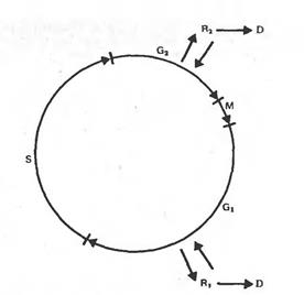 Второй путь - это утрата клеткой способности к вторичной дифференцировке и регенерации растения, стойкая дедифференцировка, приобретение способности расти на среде без гормонов, т.е. превращение в опухолевую. Такими свойствами часто характеризуются клетки старых пересадочных культур. На рисунке изображены фазы клеточного цикла, и показано, в каких из них клетки могут выйти из митотического цикла, и перейти в дифференцированное состояние и соответственно вернуться в цикл при дедифференцировке и индукции их к делению. Обычно клетки переходят к специализации из фазы G1.