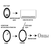ооцитов с клеткой из тотипотентной клеточной линии. Полученные таким образом эмбрионы временно помещались в овцу-реципиента. через неделю проверяли уровень их развития. Наконец, морулы и бластоцисты имплантировались другим овцам, где и проходил весь онтогенез. | |