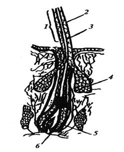 Рисунок 1. Схема строения корня волоса: 1 - стержень; 2 - кутикула; 3 - корковое вещество; 4 - сальная железа; 5 - волосяная луковица; 6 - волосяной сосочек
