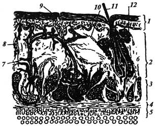 Рисунок 2. Схема строения кожного покрова животного: 1 - эпидермис; 2 - дерма; 3 - жировой слой; 4 - мускульный слой; 5 - подкожная клетчатка; 6 - сумка волоса; 7 - кровеносные сосуды; 8 - нервные окончания; 9 - проток; 10 - мышца, поднимающая волос; 11 - стержень волоса; 12 - сальная железа.
