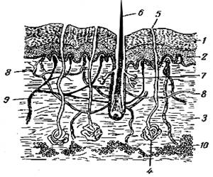 Дерму пронизывают кровеносные сосуды, ветвятся окончания чувствующих нервов, воспринимающие температурные и болевые раздражения. Поскольку пигменты расположены, главным образом, в производных кожи – чешуе, щитках, перьях или волосках,- то эти производные и являются главными носителями окраски животных. Собственно кожа обычно не окрашена.
