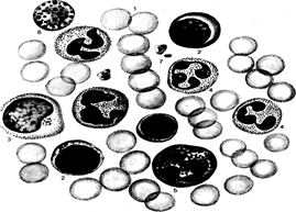 1 – эритроциты, 2- лимфоциты, 3- моноциты, 4 – нейтрофильные гранулоциты, 5 – эозинофильные гранулоциты, 6 – базофильные гранулоциты, 7 – тромбоциты.