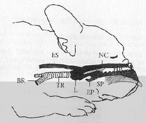 При проведении данной операции нами было применено потенцированное обезболивание, состоящее из ингаляционного спиртохлороформ-эфирного наркоза в сочетании с нейроплегиком (ромпун) и ваголитиком (атропин-сульфат). Коротконосым собакам, находящимся под наркозом, необходимо введение ваголитика (атропин-сульфат 0,1%). уменьшающего слюноотделение и секрецию слизистой оболочки трахеи подкожно в дозе 1 мл , чтобы убрать реакцию со стороны сердца при вдыхании наркоза. При несоблюдении этого момента отделяемое может попасть в дыхательные пути собаки. Влияние его проявилось через 10 минут после введения и длилось до часа. Ромпун ввели внутримышечно 1- 1,5 мл для более сильного анестезирующего эффекта. Тщательно выверили длину интубационной трубки дабы избежать попадания трубки дальше необходимого (в бронхи). Удалили лишнюю длину. Смазали ее стерильным вазелином.