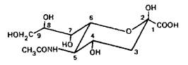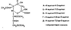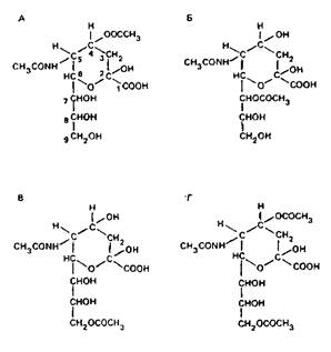 Эта полигидроксильная группировка может быть дополнительно ацетилирована и, возможно, метилирована. В природе известно несколько производных О-ацетилнейраминовых кислот, в которых ацетилированы гидроксилы у 4, 7, 8 и 9-го атомов углерода: