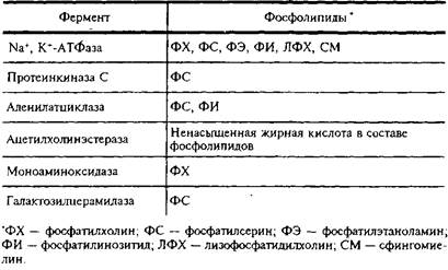 Приведем примеры функциональной роли индивидуальных липидов в мембранах ЦНС. В табл. 5 представлены данные о влиянии различных фосфолипидов на активность мембранных ферментов.