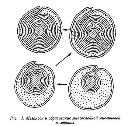 Плазматическая мембрана олигодендроцита образует вокруг аксона сложную мембранную структуру – мезаксон, который является элементарной единицей миелина, имеет пятислойную структуру: белок-липид-белок-липид-белок. Эта пя-тислойная структура, многократно закручиваясь вокруг аксона,
