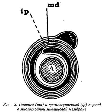 Повторяющийся период миелина определяется толщиной составляющего его липидного бислоя, «зажатого» двумя белковыми слоями, и равен 15–16 нм. Белки, частично пронизывающие бислой, занимают 5–10% площади; распределение его по поверхности бислоя неравномерно – есть области, не занятые белком. Полярные группы липидов образуют слой толщиной в 1 нм, а гидрофобная область занимает 3,3–3,8 нм.