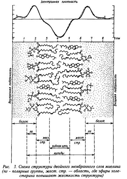 Углеводородные цепочки жирных кислот миелина упакованы плотнее, чем в других мембранах, но ближе к середине бислоя они обладают большей свободой движения. Поскольку более чем у 25% жирных кислот миелина углеродный скелет на 4–5 атомов длиннее, чем в других мембранах, то в центре бислоя может происходить переплетение ацильных радикалов. Это особенно характерно для сфинголипидов. Церебрознды, сульфамиды и полифосфоинозитнды локализованы преимущественно в наружном монослое, в котором в два раза больше холестерина. Холестерин имеет предпочтительное сродство к длинноцепо-чечным радикалам сфинголипидов и к моноеновым оксикис-лотам галактолипидов. Он интеркалирован между гидрофобными цепочками и модулирует латеральную подвижность липидов и движение ацилов внутри бислоя. В зависимости от концентрации холестерин проявляет уплотняющий, сегрегирующий эффект или увеличивает жидкостность.