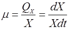 Больший интерес для характеристики интенсивности роста представляет не величина QX, а удельная скорость роста в пересчете на единицу биомассы (ведь рост биомассы пропорционален концентрации клеток). Она обозначается буквой m: