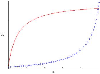 На рис. 1 показаны графики функций (9) и (10), эти уравнения дают выпуклую (9) и вогнутую (10) кривые, выходящие из нуля, но эти функции могут иметь также дополнительный свободный член qP0: