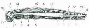 Рис. Схематическое изображение внутреннего строения одного из видов насекомого: 1 — ротовая полость; 2 — слюнные железы; 3 — пищевод; 4 — зоб; 5 — мышечный желудок; 6 — средняя кишка; 7 — тонкая кишка; 8 — прямая кишка; 9 — мальпигиевы сосуды; 10 — головной мозг; 11 подглоточнын ганглий; 12 — брюшная нервная цепочка; 13 — спинной сосуд; 14 — аорта; 15 — яичники; 16 — яйцеводы; 17 — семяприемник; 18 — придаточные железы; 19 — крыловые мышцы средне- и заднее груд.