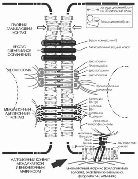 В тех тканях, в которых клетки или их отростки плотно прилежат друг к другу (эпителий, мышечная ткань и пр.) между мембранами контактирующих клеток формируются связи – межклеточные контакты. В большинстве случаев межклеточные соединения разрушаются при удалении из среды ионов Ca2+.