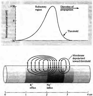 Обратимся к рассмотрению движения ионов. Если в аксон инъецирован положительный ток, внутриклеточные ионы (главным образом, калия) будут распространяться вдоль волокна. Некоторая часть ионов уйдет на изменение заряда на емкости мембраны, другая часть будет протекать по мембранному сопротивлению. Одновременно с этим процессом будет происходить перемещение отрицательных ионов в противоположном направлении. Постепенно потенциал на мембране достигнет нового устойчивого значения, емкости, распределенные по мембране, будут полностью заряжены до нового уровня потенциала, а через мембрану будет протекать постоянный ионный ток. Время, необходимое для достижения нового устойчивого состояния, определяется постоянной времени.