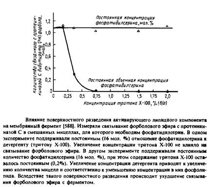 Остановимся вкратце еще на двух ферментах, которые в определенных условиях связываются с биомембранами: пируватоксидазе и фосфатидилсеринсинтетазе из Е. coli. В присутствии субстрата оба фермента перемещаются из цитозоля в цитоплазматическую мембрану. Пируватоксидаза уже упоминалась как пример липидзависимого фермента. В присутствии пирувата, восстанавливающего связанный с белком флавиновый кофактор, фермент по своим свойствам становится классическим мембранным белком. Он восстанавливает растворенный в мембране убихинон и поэтому для своего функционирования должен быть связан с мембраной. В норме при очистке фосфатидилсеринсинтазы она выделяется в связанном с рибосомами виде, но в присутствии либо субстрата, либо продукта оказывается связанной с мембраной.