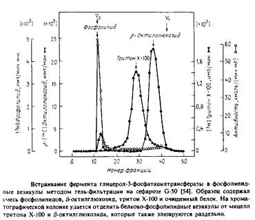 Ориентация белка. Этот вопрос важен с точки зрения энзимологии, поскольку белок, активный центр которого локализован внутри везикулы, может быть недоступен для субстрата. Как ни удивительно, многие ферменты, например цитохром с-оксидаза, Ыа + /К+-АТРаза, глицерол-3-фосфатацил-трансфераза, бактериородопсин, способны встраиваться в мембрану таким образом, что их активный центр с вероятностью 75-95Чо оказывается снаружи везикулы. Везикулы, содержащие цитохром с-оксидазу, с помощью ДЭАЭ-хроматографии удается разделить на две популяции: с активным центром, ориентированным внутрь, и с активным центром, ориентированным наружу. В принципе такой способ разделения пригоден и для других белков.